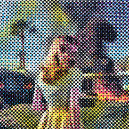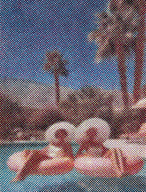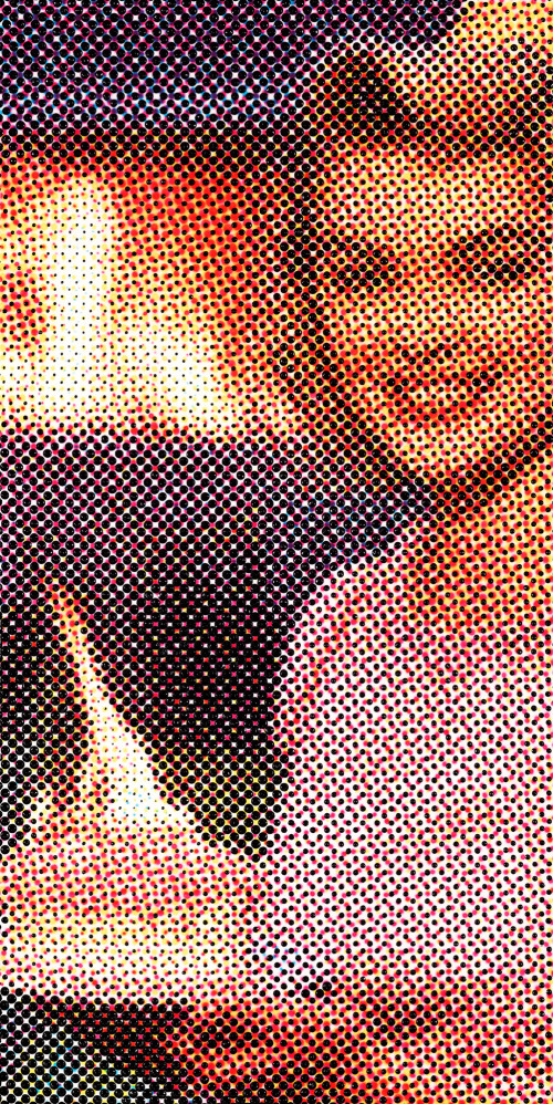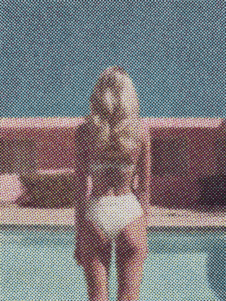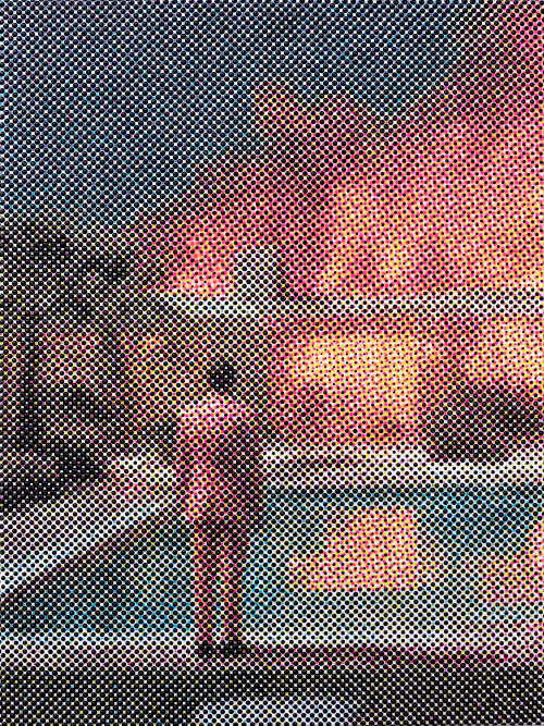 Maggie Hall creates large scale paintings that transform pop cultural imagery through a meticulous CMYK dot process using hundreds of thousands of hand applied circles. Her works begin with AI prompting and digital collage but become grounded in physical labour, turning nostalgic subjects into emotionally charged scenes.
